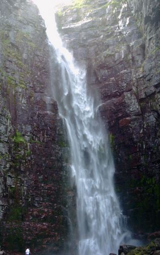 Vieille, lisse, érodée par les glaces-bulldozers de la dernière période glaciaire, on aurait dit une montagne préhistorique. Pas plus de 200 ou 300 mètres plus haut que le plateau sur lequel nous marchons. Le sommet le plus élevé atteint 1044 mètres. Face à nous, dans une faille taillée dans le flanc de la montagne, la plus haute cascade de Suède, Njupeskär, se jetait dans le vide, chutait sur plus de 90 mètres avant de s’écraser sur les gros blocs de glace en contrebas. A moitié libérée de l’emprise du gel, la cascade semblait perdre sa mue, comme les animaux à cette époque de l’année.